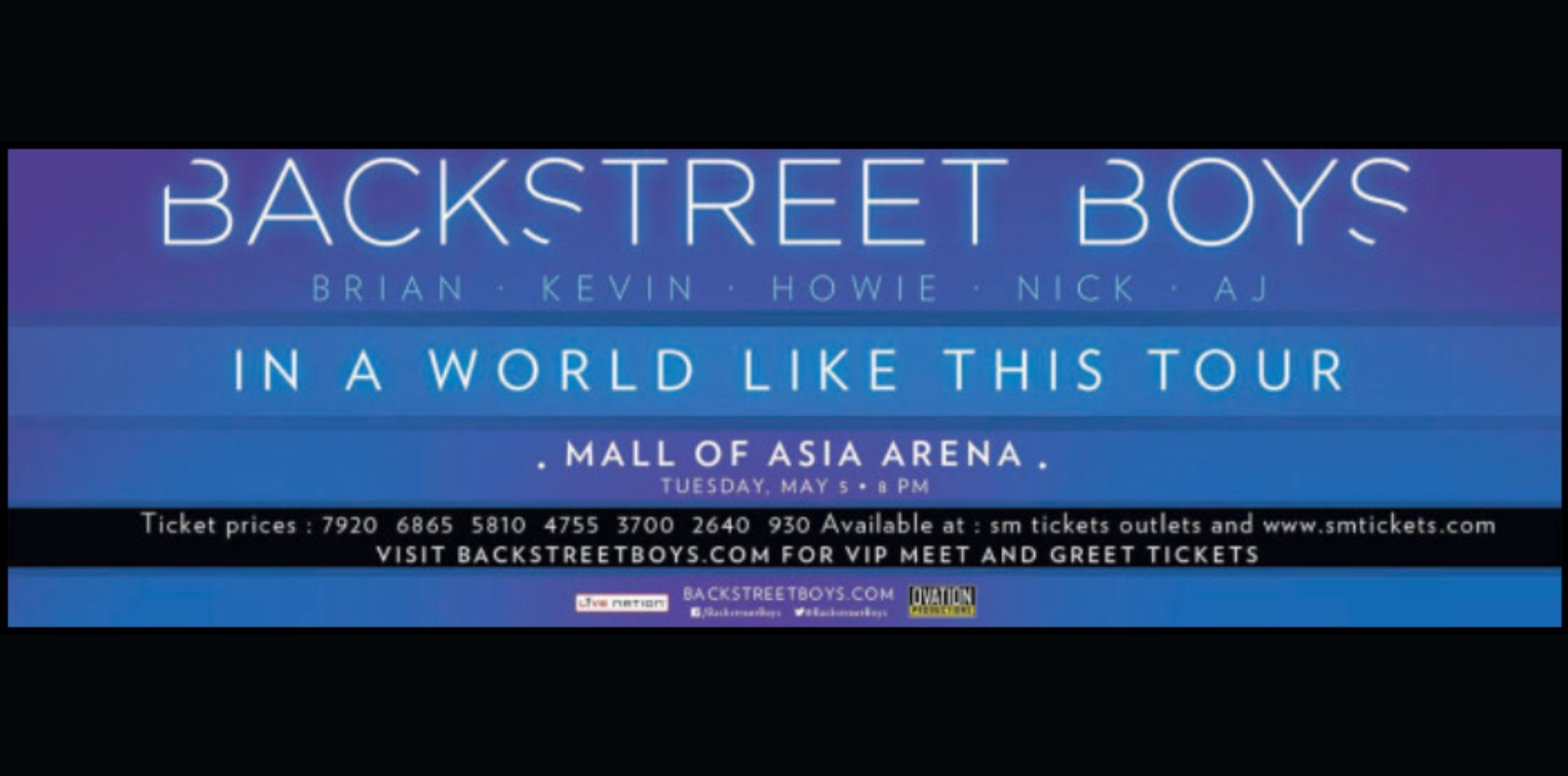 The Backstreet Boys' 'In a World Like This Tour' concert in the Philippines was held on May 5, 2015, at the Mall of Asia Arena.